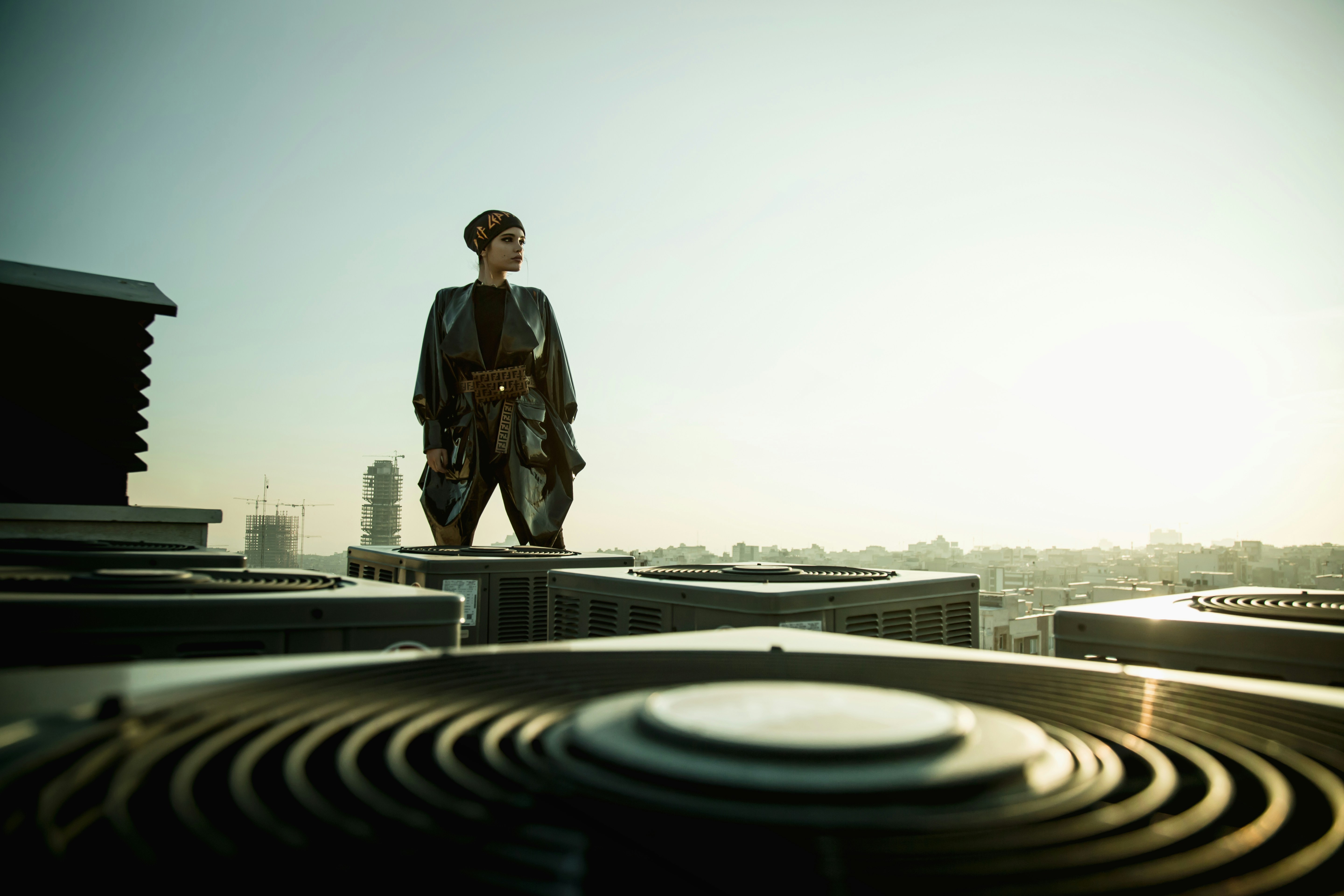 Model in designer black evening gown on urban rooftop with city skyline