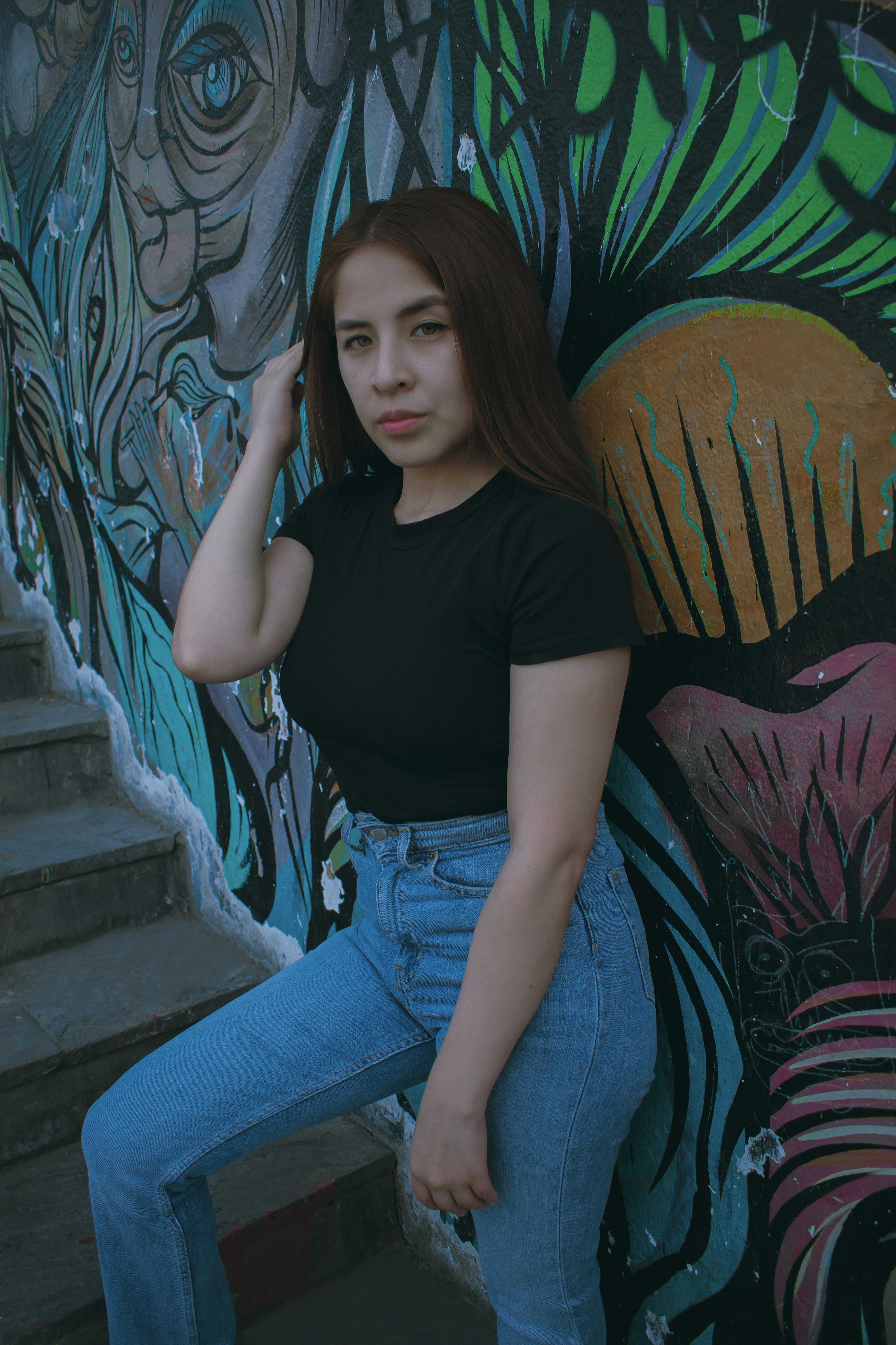 Fashion model in trendy streetwear posing against colorful graffiti wall