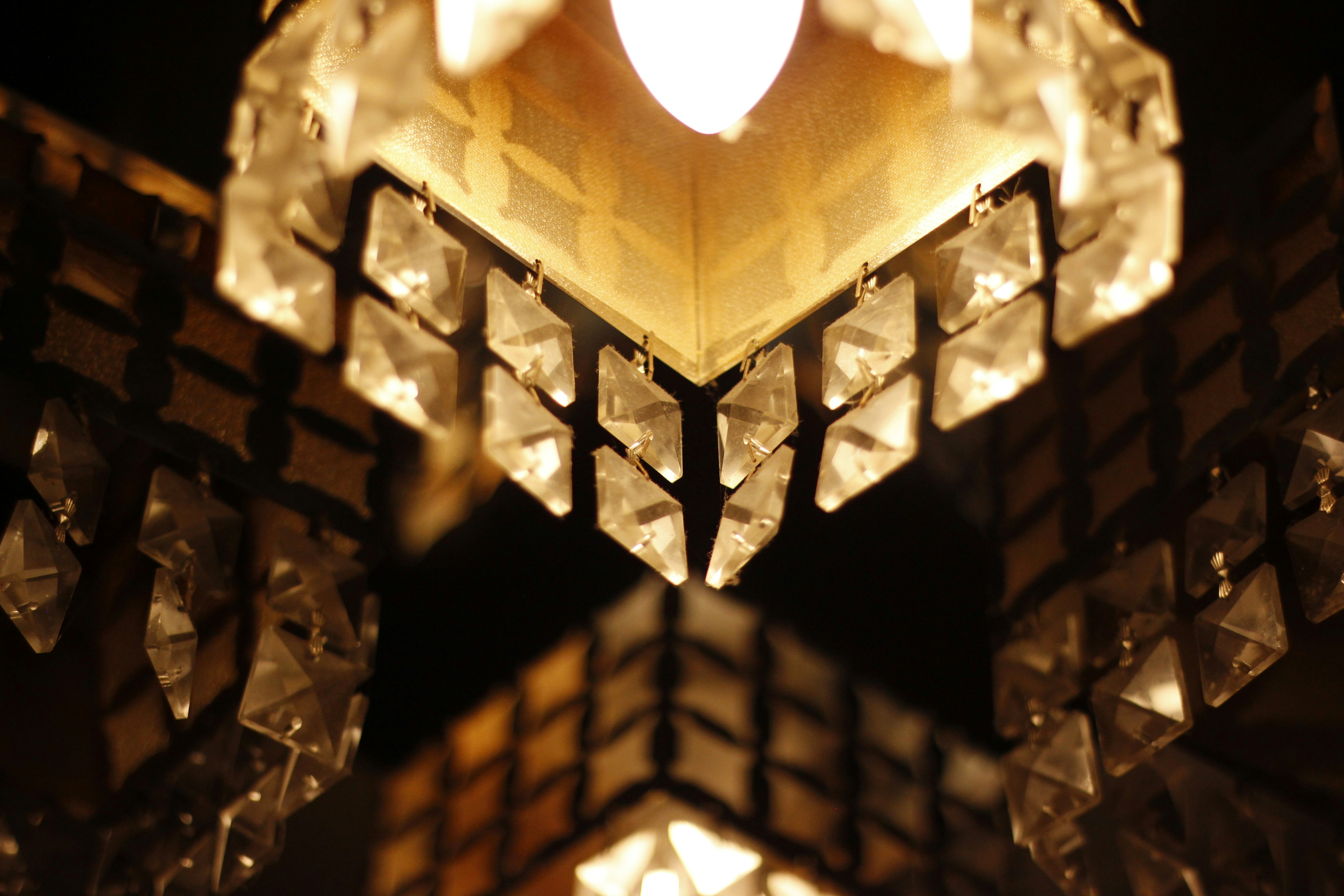 Corporate gala attendees networking under crystal chandelier with golden lighting