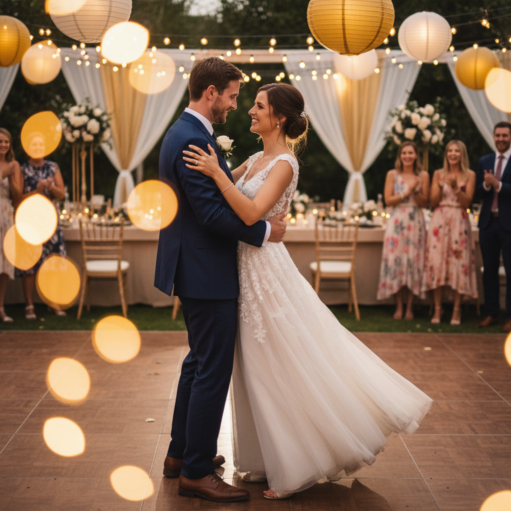 First dance under string lights at outdoor garden wedding reception